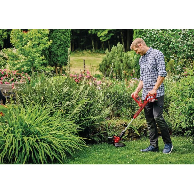 • La recortadora de césped con batería GE-CT 18/30 Li-Solo de Einhell da lugar a un césped perfecto. Sean ruedas, superficies, esquinas, aristas: Nada es un problema para el ayudante del jardín sin cables. Aquí ayuda el movimiento telescópico sencillo, rápido y cómodo del larguero de guiado. El asa adicional regulable aporta una manipulación agradable, el agarre suave ofrece perfecta comodidad. El cabezal motor puede girar 90º en superficies y aristas de césped verticales. Incl. rueda de guiado es posible el corte de arista preciso. Además, puede inclinarse triplemente y garantiza así un trabajo flexible bajo arbustos u otros obstáculos. El protector de flores protege plantas y árboles de deterioros. El alcance del envío contiene una bobina de hilo (5m), la unidad aut. pulsada aporta el práctico seguimiento del hilo según sea necesario. Recortadora de césped accionada con batería de 18V de la serie PXC. Baterías de esta familia de sistema son intercambiables entre sí. El envío se realiza sin batería ni cargador. Estos son adquiribles por separado, por ejemplo, como un práctico set para principiantes.