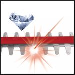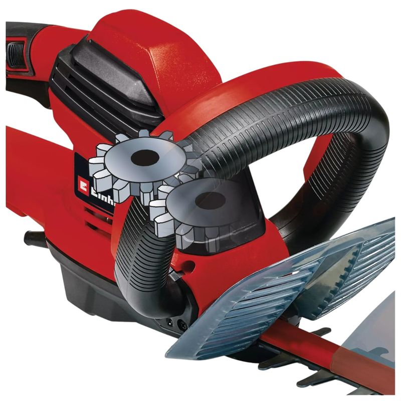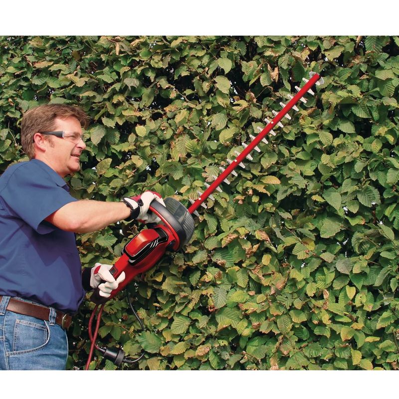 • Con el recortasetos eléctrico GE-EH 6560 de Einhell, la poda de setos, arbustos y malezas es algo fácil. Con una longitud de corte de 600 milímetros y gracias a los 650 vatios de potencia, es una herramienta potente y de alta calidad para cortar de manera fiable y en la forma deseada. El recortasetos eléctrico Einhell GE-EH 6560 ofrece 3000 cortes por minuto con una distancia entre dientes de 30 milímetros. La cuchilla de acero cortada con láser y afilada con diamante está diseñada para proporcionar precisión y una larga vida útil. El recortasetos está equipado con un engranaje de metal para una larga vida útil. El mango adicional garantiza una ergonomía óptima y un agarre seguro y potente en cada ángulo de corte. El mango trasero es giratorio, lo que permite un trabajo sin fatiga. El interruptor de seguridad de dos manos con la parada de la cuchilla en menos de un segundo proporciona mayor seguridad. El recortasetos eléctrico de Einhell GE-EH 6560 también está equipado con un protector de mano de amplia superficie y una cubierta de aluminio para cuchillas. El alivio de tensión del cable también se utiliza para un funcionamiento seguro. Para un almacenamiento y transporte óptimos, se proporciona una bolsa resistente para el recortasetos. Después de cortar el seto, el material cortado se puede retirar perfectamente de la parte superior del seto gracias al práctico recogedor.