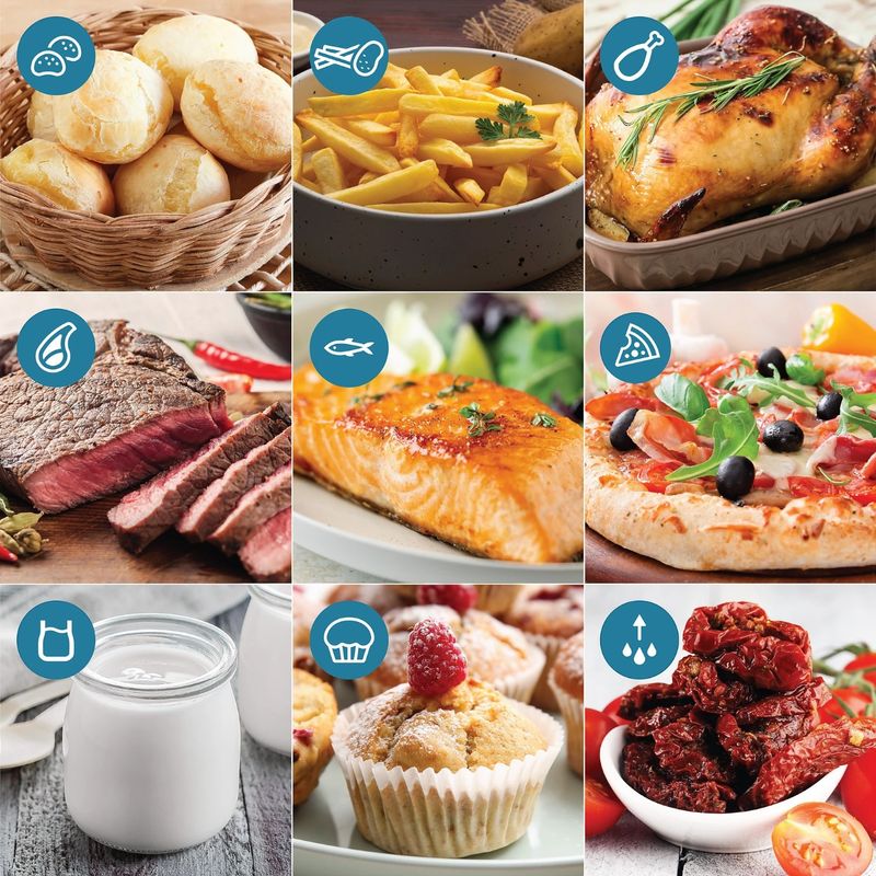 • Pantalla táctil con 10 programas predeterminados: Toque un botón y cocine. Los programas predeterminados incluyen pan con queso, papas fritas, pollo, carne vacuna, pescado, pizza, yogur, pastel/pastelillo, deshidratación y mantenimiento de calor. En el panel, también puede ajustar la temperatura, el tiempo y encender la luz interna.